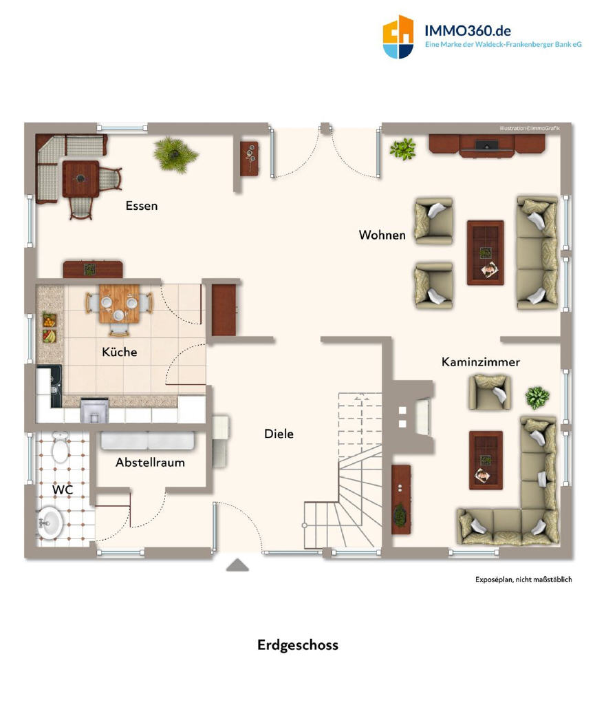 Das Haus empfängt Sie im Erdgeschoss mit einem großzügigen Flur. Die geräumige Küche mit Einbauküche lädt zu gemütlichen Kochabenden ein. Herzstück ist der lichtdurchflutete Wohn- und Essbereich mit direktem Zugang zur Terrasse und dem idyllischen Garten. Ein besonderes Highlight ist das angrenzende Kaminzimmer, ideal für behagliche Stunden in der kalten Jahreszeit. Ein Gäste-WC sowie ein praktischer Abstellraum ergänzen das Raumangebot auf dieser Ebene.