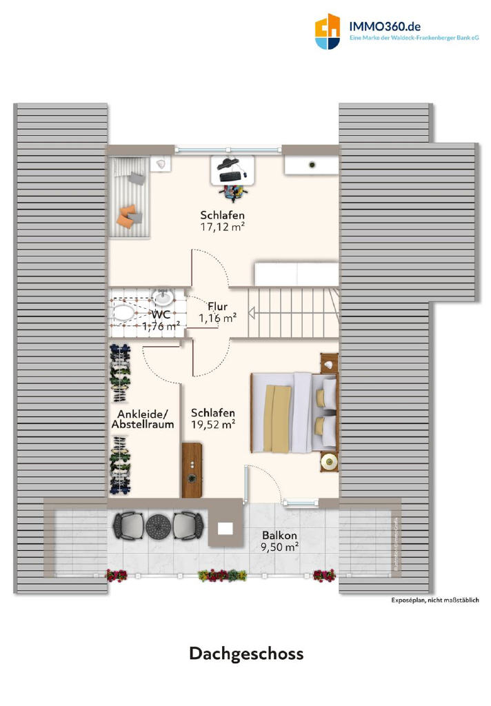 Im Dachgeschoss befinden sich zwei gemütliche Schlafzimmer, von denen eines einen Ankleide- bzw. Abstellraum sowie einen direkten Zugang zum Balkon bietet. Von diesem Balkon aus genießen Sie einen schönen Blick in Richtung Diemelsee und können den Ausblick in ruhiger Atmosphäre auf sich wirken lassen. Zusätzlich steht im Dachgeschoss ein separates Gäste-WC zur Verfügung, was den Wohnkomfort nochmals erhöht.