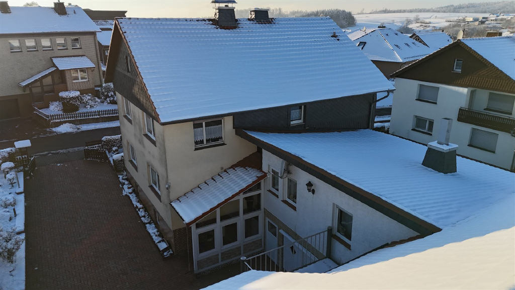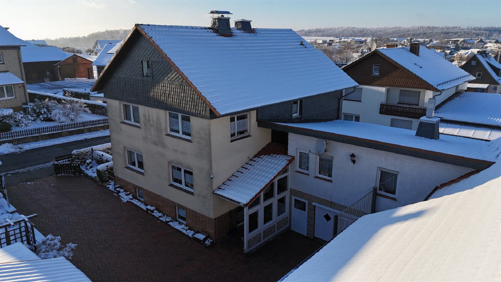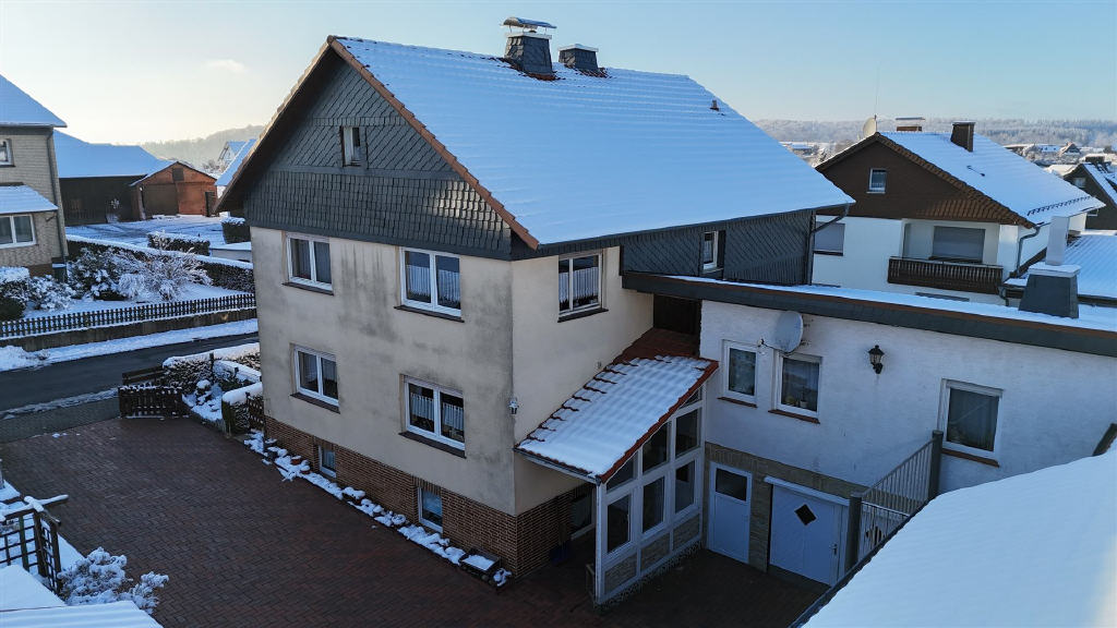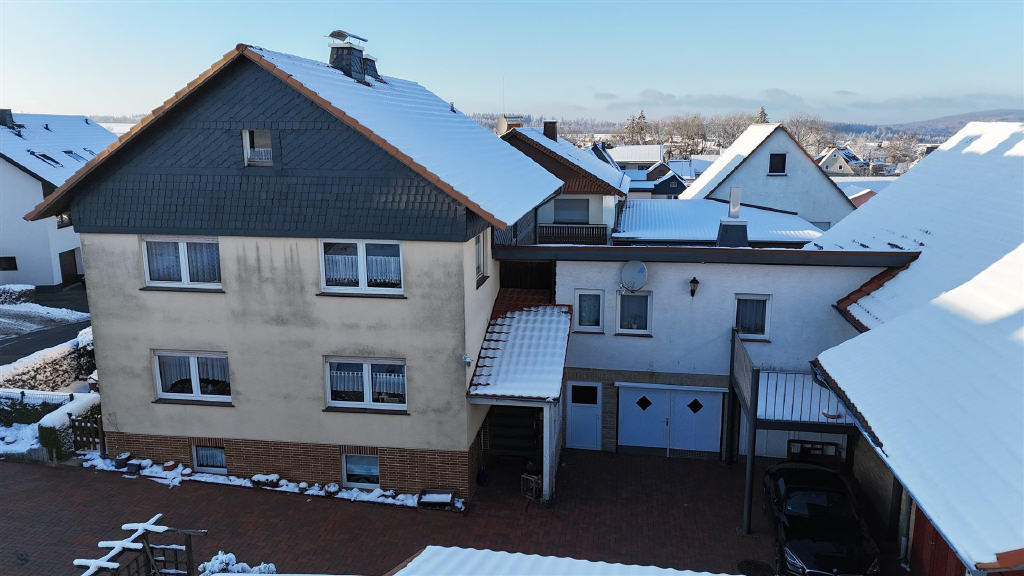 Willkommen in diesem großzügigen Einfamilienwohnhaus mit Einliegerwohnung in Haina-Löhlbach. Das Haupthaus, erbaut im Jahr 1967, wurde in Teilen bereits modernisiert und bietet mit acht Zimmern und ca. 160 qm Wohnfläche viel Platz auf insgesamt drei Etagen. Das angrenzende Nebengebäude wurde im Jahr 2005 zu Wohnzwecken umgebaut, was vielfältige Nutzungsmöglichkeiten schafft. Dort sind ebenfalls ca. 160 qm Wohnfläche entstanden. Über einen separaten Eingang gelangt man in den offenen und hellen Wohnbereich, mit einer Küche, einem großzügigen Esszimmer mit direktem Zugang zum Balkon, einem Badezimmer, einem Gästezimmer, einem großen und hellen Wohnzimmer und einem Elternschlafzimmer.