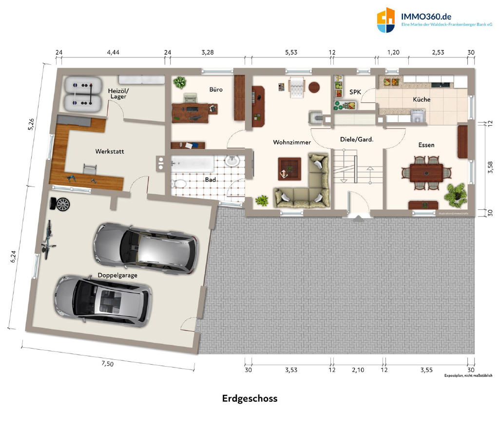 An das Wohnhaus angebaut sind eine Doppelgarage sowie eine Werkstatt, die ideal für Hobbyhandwerker, Fahrzeugliebhaber oder zusätzlichen Stauraum geeignet sind.