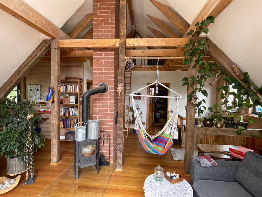 Auf dem Nebengebäude ist zudem eine Photovoltaikanlage (Mietanlage Enpal) installiert, die zur Energieeffizienz des Hauses beiträgt. Vor rund 20 Jahren wurde die Außenfassade umfassend gedämmt und mit hochwertigem Schiefer verkleidet, was sowohl energetisch als auch optisch einen deutlichen Mehrwert bietet. Neben dem Grundofen im Erdgeschoss besteht auf jeder Etage die Möglichkeit, einen Holzofen anzuschließen.